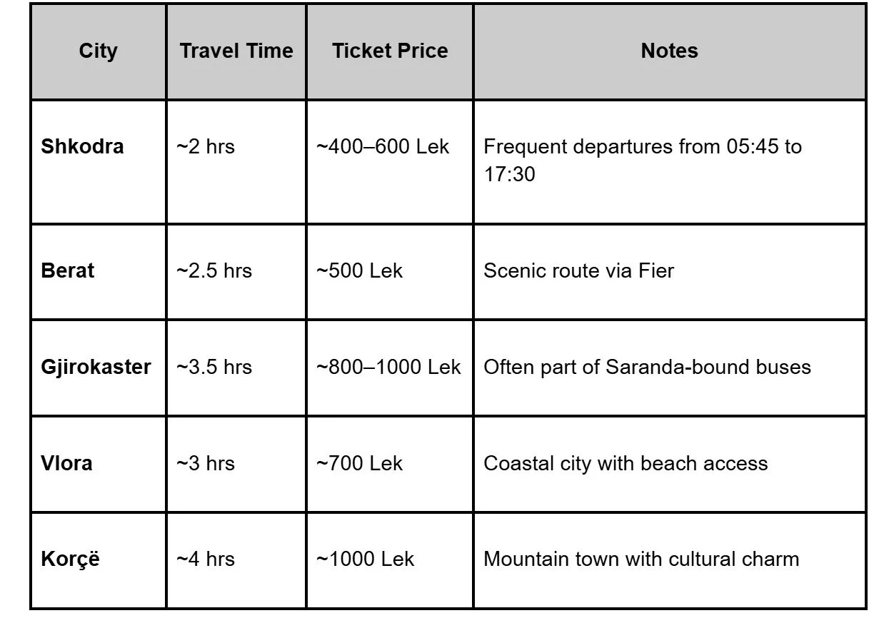 Tickets: Vary by destination (e.g., Tirana to Athens ~€35)
