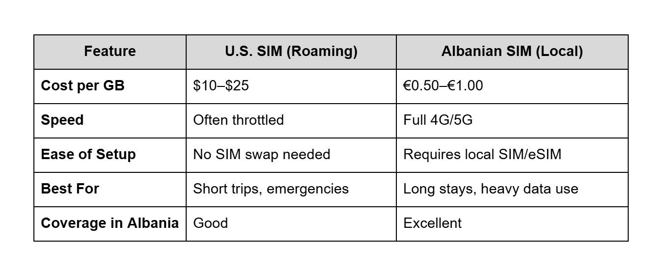 Pro tip: bring a dual SIM phone so you can keep your U.S. number active for banking, texts, and two-step verifications while fully embracing your new Albanian setup.