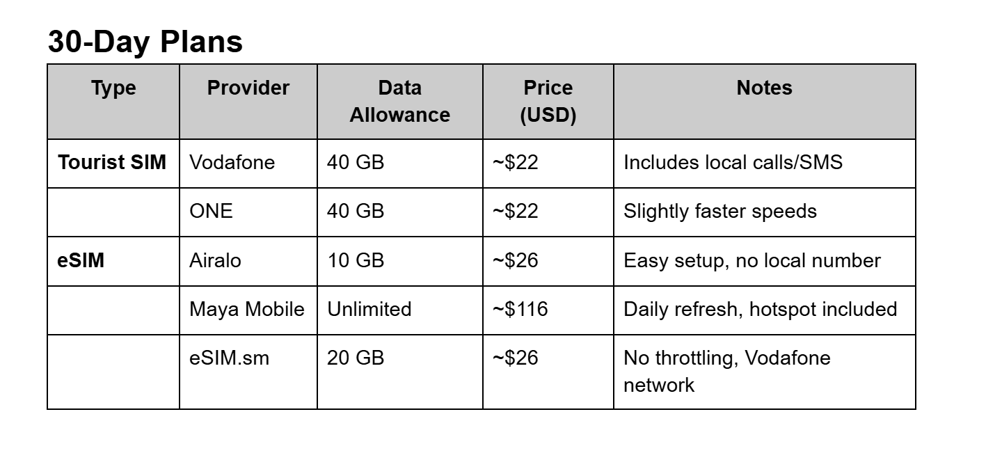 Tourist SIM: ~$25 for 40GB, valid 30 days
